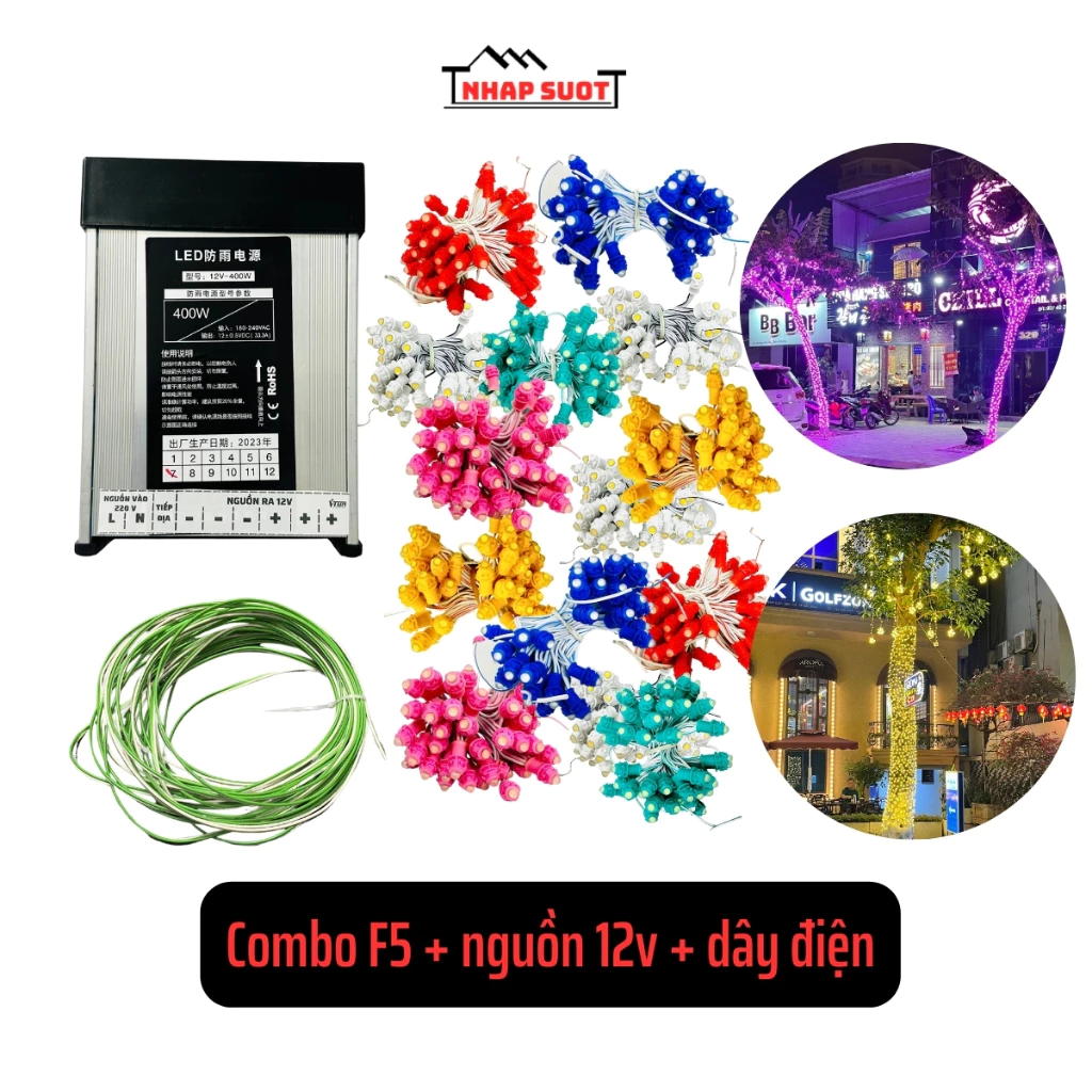 Bộ đèn Bộ led F5 cuốn cây có nguồn 12v 33a và dây điện trục là một lựa chọn tốt với nguồn điện 12V 33A, đảm bảo an toàn khi sử dụng ngoài trời.