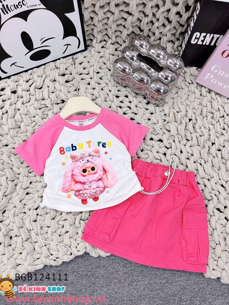 🔥 Set bộ quần áo bé gái, áo thun tay ngắn dây rút in phủ BABY THREE mix chân váy xoè dễ thương đi chơi đang giảm giá!