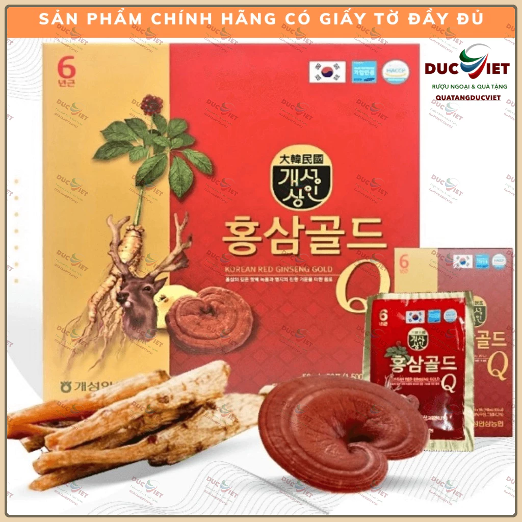 Nước Hồng Sâm Nhung Hươu Linh Chi Gold Q có thành phần chính bao gồm hồng sâm, nhung hươu và linh chi. Mỗi thành phần đều có những công dụng riêng và đóng góp vào hiệu quả tổng thể của sản phẩm.